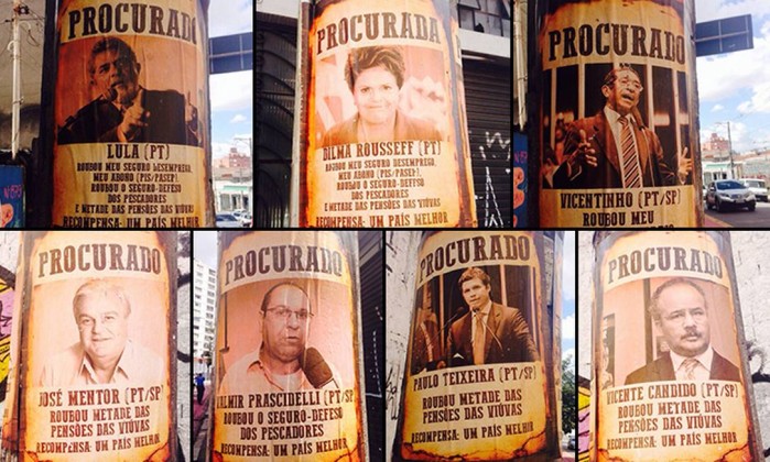 Cartazes colados em postes com rostos da presidente Dilma, Lula e demais petistas estão espalhados pela capital paulista com os seguintes dizeres: